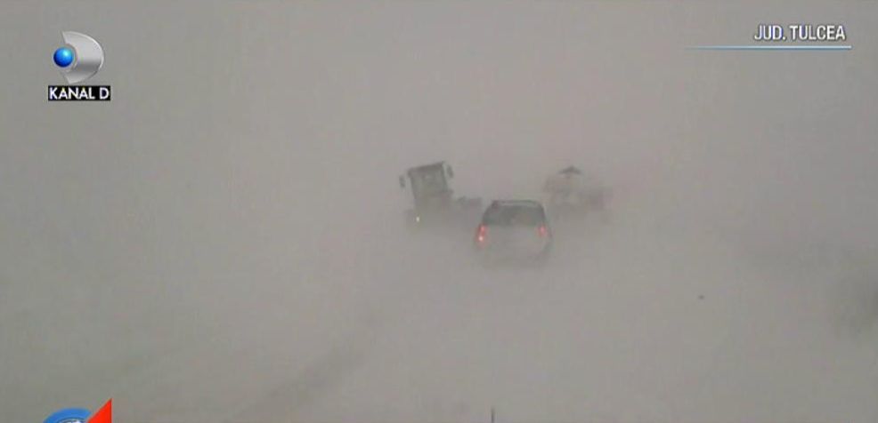 Dezastru, neputina, disperare! Pe-un vant teribil, ce a suflat cu o suta de kilometri pe ora, drumul din Tulcea s-a transformat intr-un imens cimitir de masini in care soferii isi asteptau salvarea.