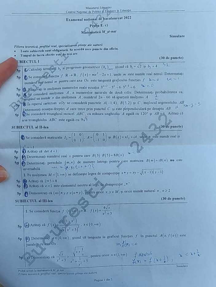 Citeste si: Subiecte simulare BAC 2022 Matematică M1, M2, M3 şi M4. Baremul de corectare, pe EDU.ro
