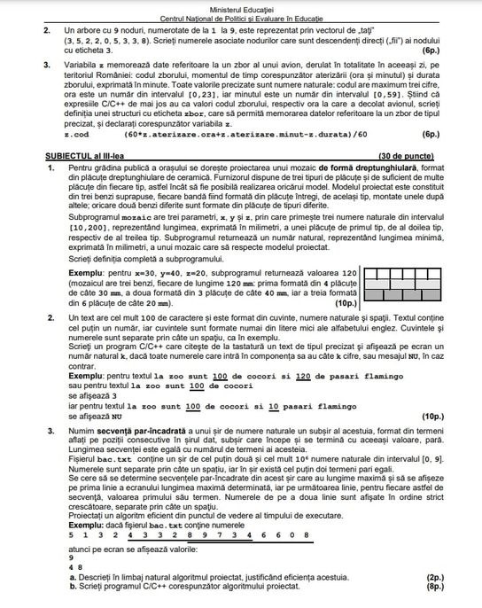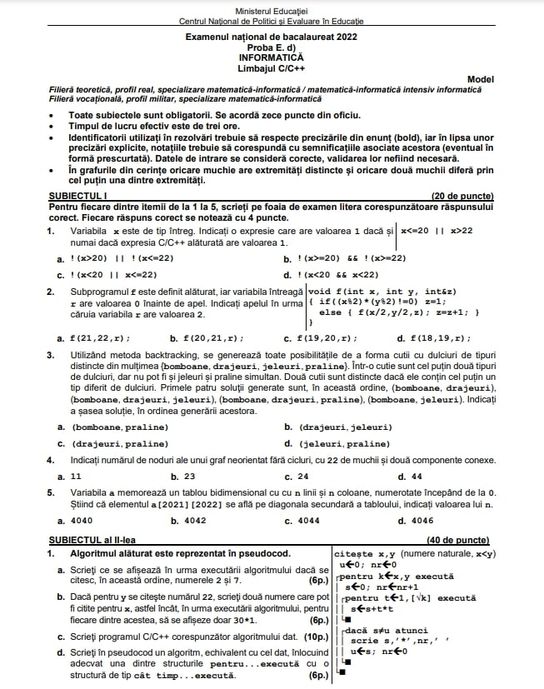Modelele de subiecte pentru proba de Informatică din cadrul examenului de BAC 2022 au fost publicate pe site-ul oficial al Ministerului Educației, mai exact pe pagina cu informațiile dedicate Bacalaureat 2022, subiecte.edu.ro.
