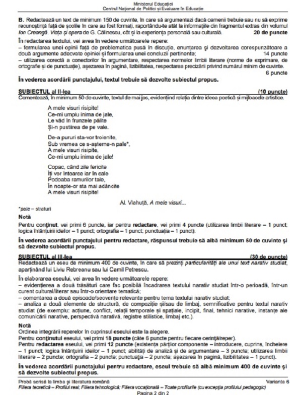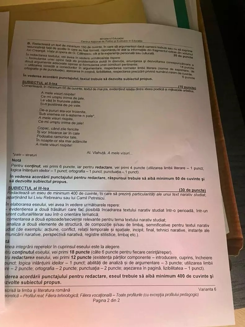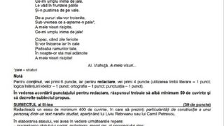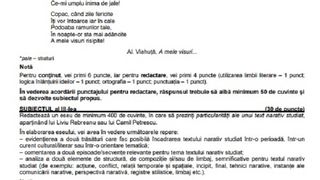 UPDATE: Candidații de la profilul real au avut la primul subiect mai multe cerințe pe baza unui text suport „Ion Creangă viața și opera”, de George Călinescu. Subiectul II a constat în evidențierea relației dintre ideea poetică și mijloacele artistice într-o poezie semnată de Alexandru Vlahuță. La subiectul al III-lea candidații au avut de redactat un eseu de 400 de cuvinte în care să prezinte particularitățile unui text narativ studiat ce aparține lui Liviu Rebreanu sau Camil
