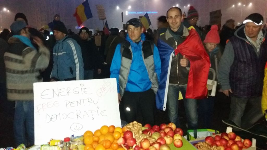 Un antreprenor din Romania a atras toate privirile la protestele din Piata Victoriei. Si-a mutat biroul in fata Guvernului, apoi a organizat un stand cu fructe si apa, pe care le-a impartit gratuit protestatarilor.