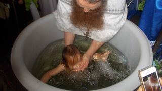 6 din 6 | El este preotul ortodox devenit celebru, pentru ca boteaza adulti! Persoanele intra in cristelnita si se lasa scufundate in apa de trei ori!