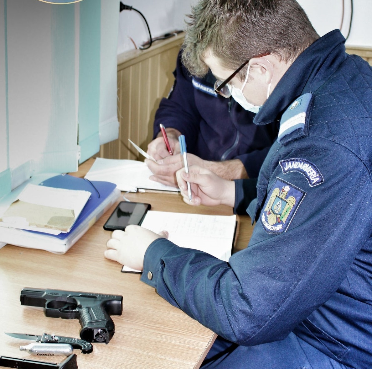 Jandarmii au descoperit că tinerii, în vârstă de 17, respectiv 19 ani au pătruns în liceu cu un briceag și un pistol de tip airsoft.
