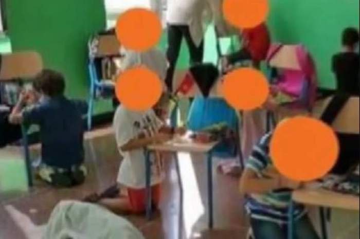 Elevii au fost fotografiați în timp ce se aflau în genunchi, pe podea, în sala de curs. Măsura a fost luată chiar de profesorul lor. Așa cum se poate vedea în imagini, cei mici folosesc scaunele pe post de masă, încercând să se adapteze deciziei dascălului lor.