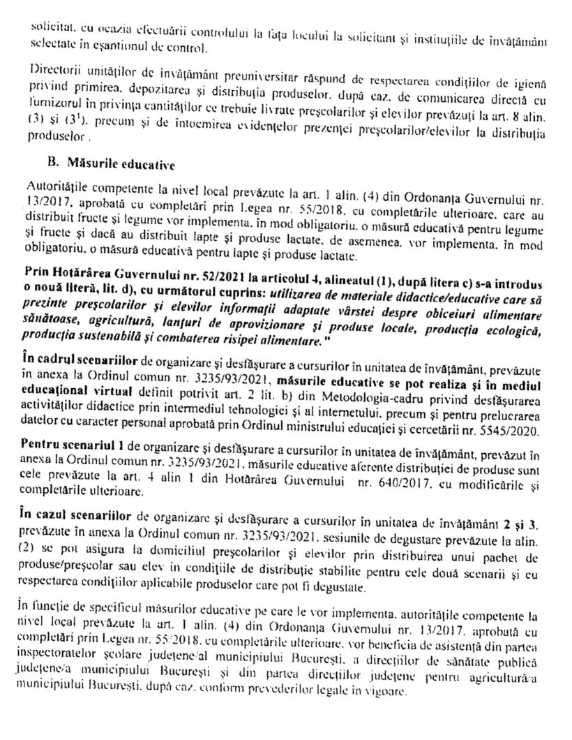 „Pentru produsele primite și consumată de către elevii din celelalte clase din scenariul 3 b) prin ridicarea acestora de către părinți se vor întocmi și păstra documente justificative specifice în vederea confirmării plății pentru ajutorul financiar FEGA solicitat cu ocazia efectuării controlului la fața locului la solicitant și instituțiile de învățământ selectate în eșantionul de control”, mai precizează documentul.