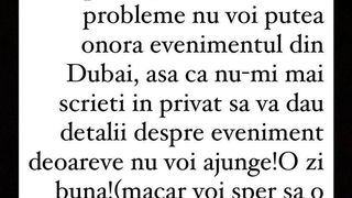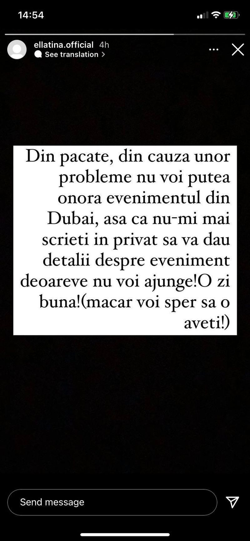 Totodată, Ella anunțat în urmă cu doar câteva ore faptul că din cauza unor probleme nu va ajunge la un eveniment care se ține în Dubai și a subliniat faptul că nu are o zi bună.