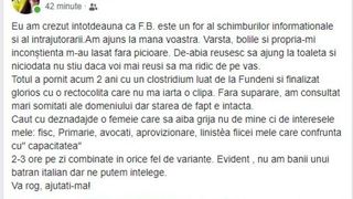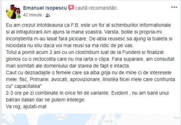 „Caut cu deznadajde o femeie care sa aiba grija nu de mine ci de interesele mele: fisc, Primarie, avocati, aprovizionare, linistea fiicei mele care confrunta cu ”capacitatea". 2-3 ore pe zi combinate in orice fel de variante. Evident, nu am banii unui batran italian dar ne putem intelege. Va rog, ajutati-ma!”, a încheiat Emanuel Isopescu.