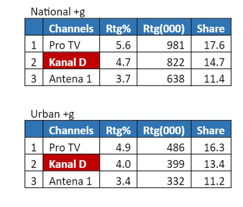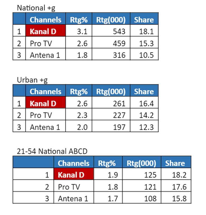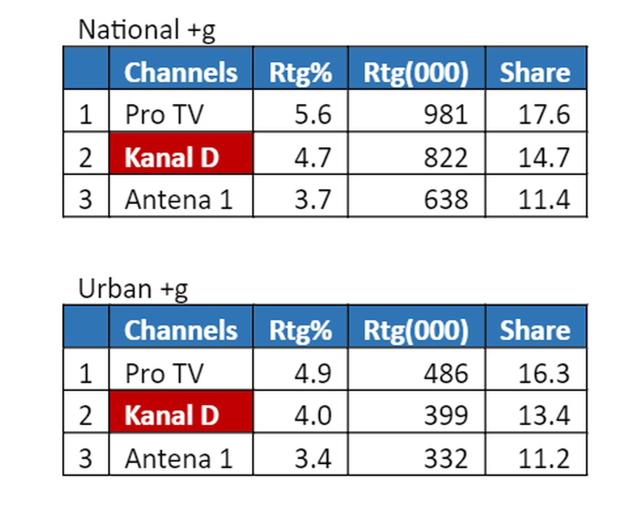 Cu prima parte a emisiunii, difuzată în intervalul orar 10:00 – 12:00, Kanal D a fost lider absolut de audiență, înregistrând 3,1% rating si 18,1% cotă de piață, pe targetul Național, 2,6% rating si 16,4% cotă de piață, pe targetul All Urban, si 1,9% rating si 18,2% cotă de piață, pe targetul Comercial (21-54 Nat ABCD). Emisiunea a atras în fața micilor ecrane o medie de peste o jumătate de milion (543.000) de telespectatori din întreaga țară în fiecare minut al difuzării.