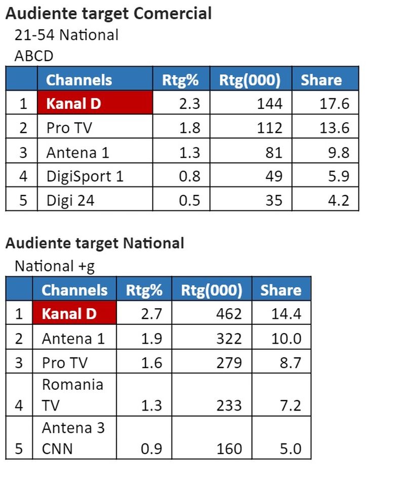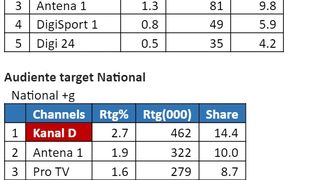 O medie de 462.000 de telespectatori au urmărit ieri Kanal D în intervalul sus menționat, minutul de aur fiind înregistrat la 14:45, când 769.000 de fani ai emisiunii urmăreau materialele inedite prezentate în emisiunea ”ROventura”.