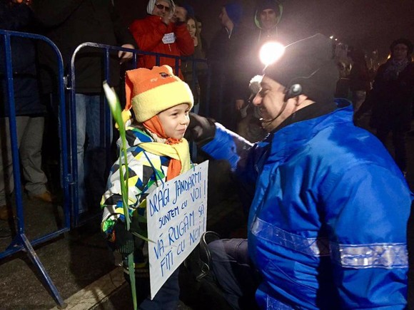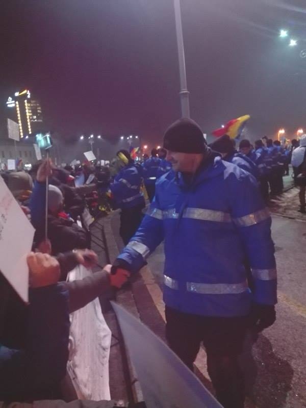 2 din 3 | Emotii la protestul de aseara. Oamenii i-au cantat "la multi ani" unui jandarm, care si-a sarbatorit ziua in Piata Victoriei, asigurandu-se ca manifestatia e pasnica