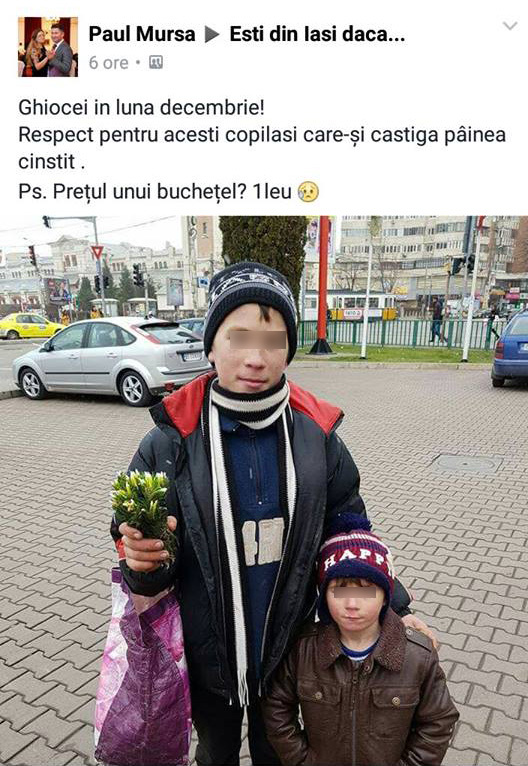 Primarul comunei iesene Plugari, Paul Mursa, a distribuit povestea a doi copii din satul Horelsi, care vand ghiocei in luna decembrie pentru a-si ajuta familia.