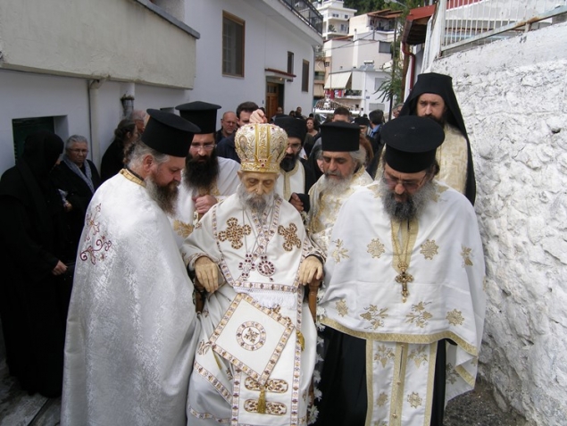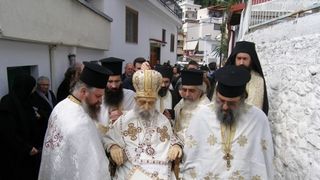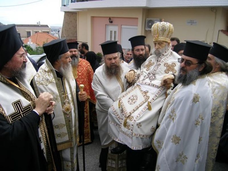 Imbracat in straiele preotesti, batranul episcop a fost purtat pe strazile grecesti de la catedrala Sfantul Spiridon, pana la manastirea Sfantul Athanasie.