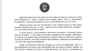 Potrivit documentului prezentat, Guvernul sustine, sub semnatura premierului Viorica Dancila, ca, pentru ca obiectivele protestului din 10 august nu erau clar definite, asociatiile romanilor din strainatate, initiatoare ale manifestatiei, s-au retras din organizarea acestuia.