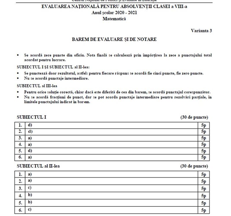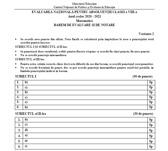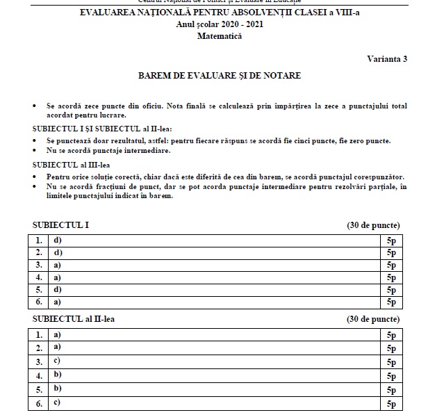 Evaluare Națională 2021. Baremul de corectare la matematică. După publicarea subiectelor pe EDU.ro, au fost publicate baremele de corectare AICI. Mai jos variantele publicate de EDU.ro: