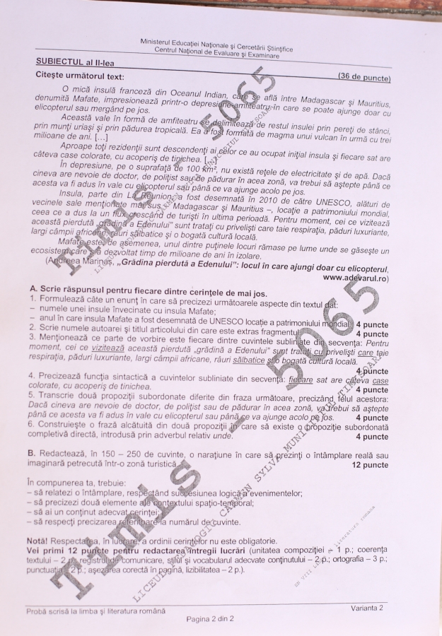 Testarea va incepe la ora 9.00 si va dura doua ore. Examenul este structutrat pe doua subiecte mari. Pe baza a doua texte, elevii trebuie sa raspunda la mai multe intrebari.
