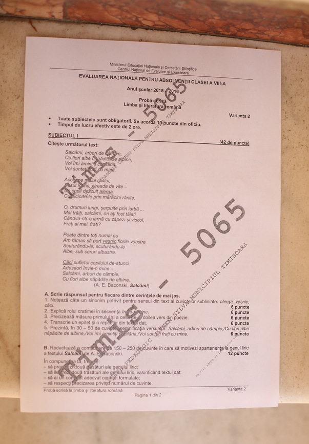 3 din 3 | Evaluarea nationala 2016. Peste 153.000 de elevi sustin astazi proba la limba romana. Subiecte: poezie de Baconski si o naratiune despre o zona turistica