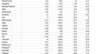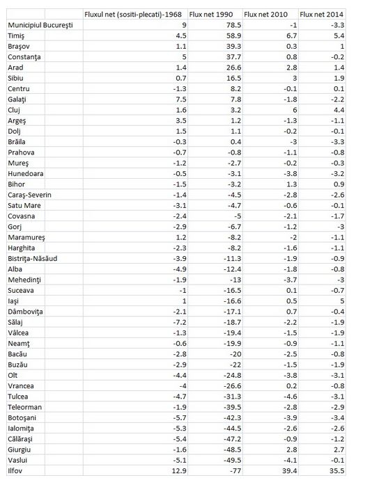 Mai jos, un tabel cu soldul net al migratiei interne (prin scaderea ponderii celor care parasesc judetul din ponderea noilor veniti in respectivul judet)