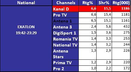 Miercuri, in intervalul orar mentionat mai sus, Kanal D a inregistrat 6,6 puncte de rating si 15,5% cota de piata, pe targetul National.