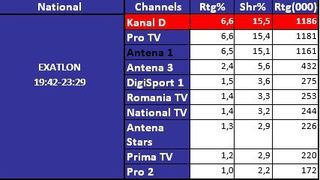 In intervalul 19:42 – 23:29, Kanal D a fost postul de televiziune cel mai urmarit din toata tara, clansandu-se pe primul loc in topul audientelor, cu “Exatlon”. Duelul dramatic intre Doru Mesesan, de la Razboinici, si Yamato Zaharia, de la Faimosi, a strans in fata micilor ecrane, la Kanal D, peste 1.7 milioane de fani din intreaga tara.
