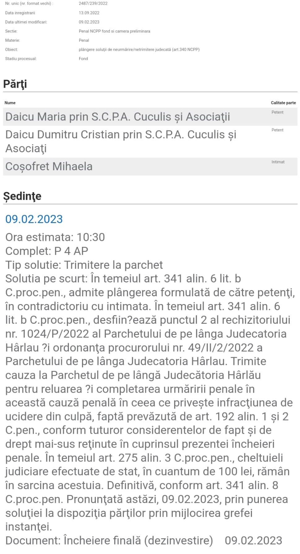 ”Instanța de judecată restituie cauza la parchet pentru a relua urmărirea penală în legatură cu uciderea din culpă a fetiței. Amintesc situația aberantă prin care polițistul și procurorul de anchetă, nu au trimis-o în judecată pe șoferița fără permis și pentru ucidere din culpă, ci doar pentru lipsa permisului de conducere.