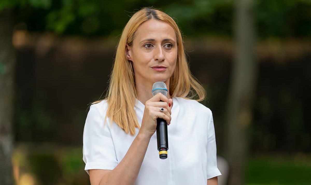 4 din 5 | Camelia Potec în timpul unui interviu, îmbrăcată cu un tricou alb