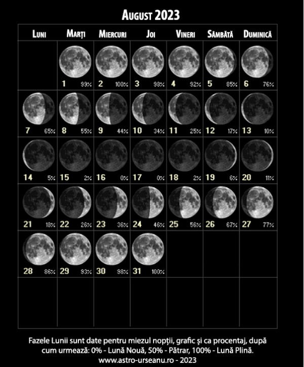 Citește și: Fazele lunii august 2023: Când este Lună Plină şi Luna Nouă?
