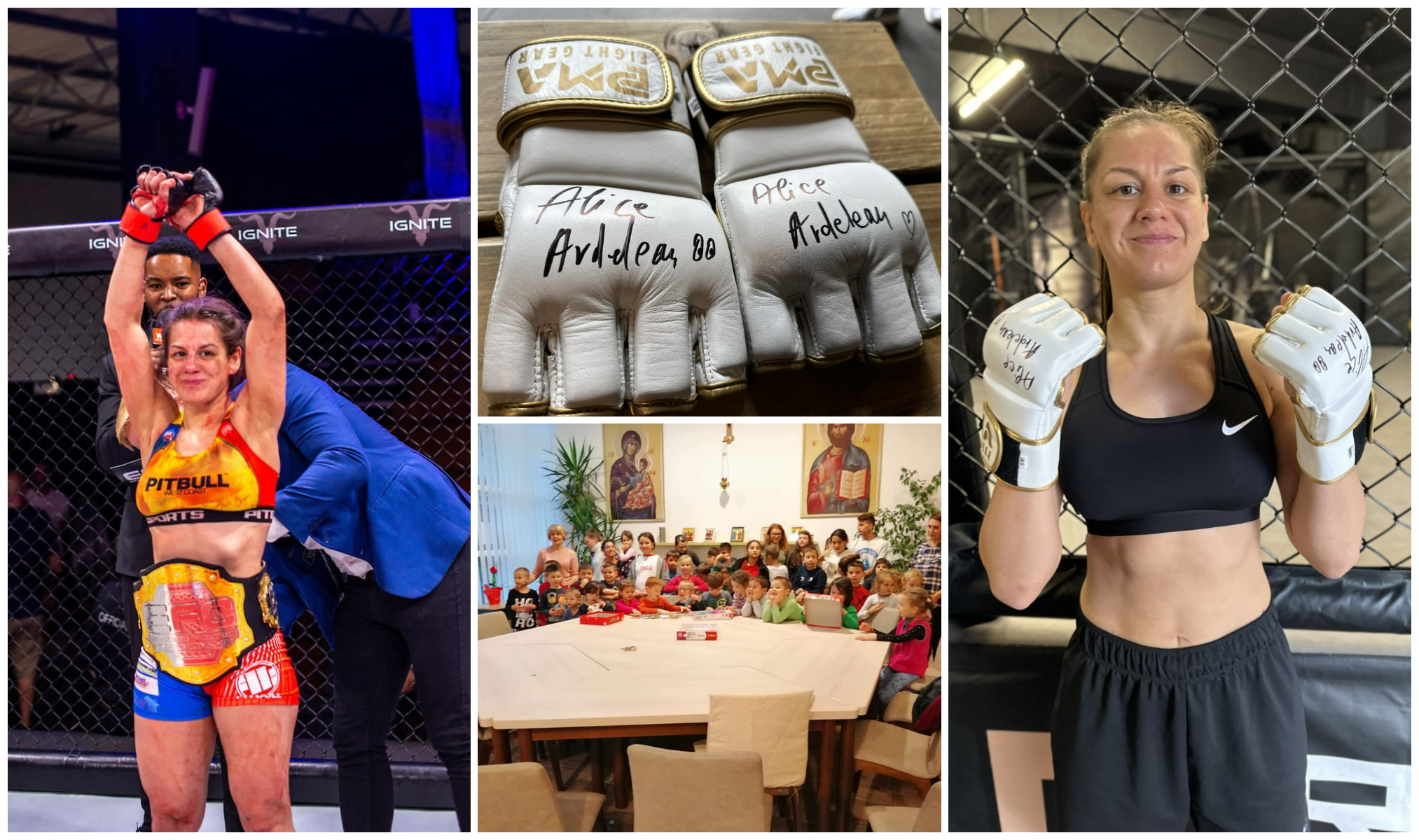 Alice Ardelean, în vârstă de 30 de ani este luptătoarea MMA din România, care însă a decis să se mute în Anglia pentru a putea face performanță. Deși departe de țara ei natală, sportiva spune că s-a acomodat și nu regretă nimic. Recent, aceasta a decis să-și ofere mănușile semnate unei licitații caritabile. Mai exact, cu banii obținuți, 16 copii de la Centrul de Zi “Sfânta Tatiana” vor avea ocazia să vadă marea pentru prima dată.