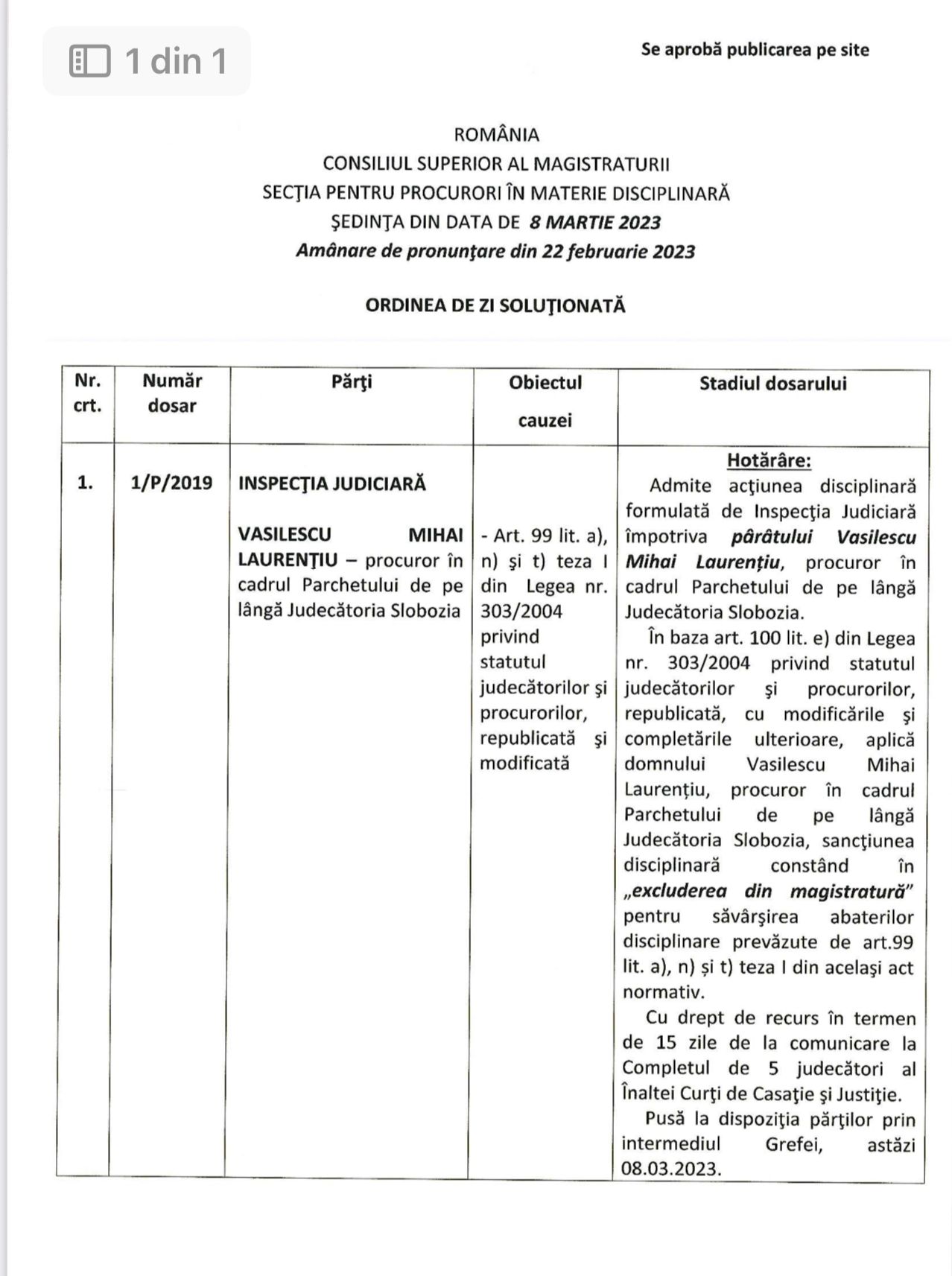 Acuzațiile Inspecției Judiciare au fost confirmate de Secția de Procurori de la CSM, care, în ședința din 8 martie 2023, au hotărât: „Admite acțiunea disciplinară formulată de Inspecția Judiciară împotriva procurorului Vasilescu Mihai Laurențiu, procuror în cadrul Parchetului de pe lângă Judecătoria Slobozia.