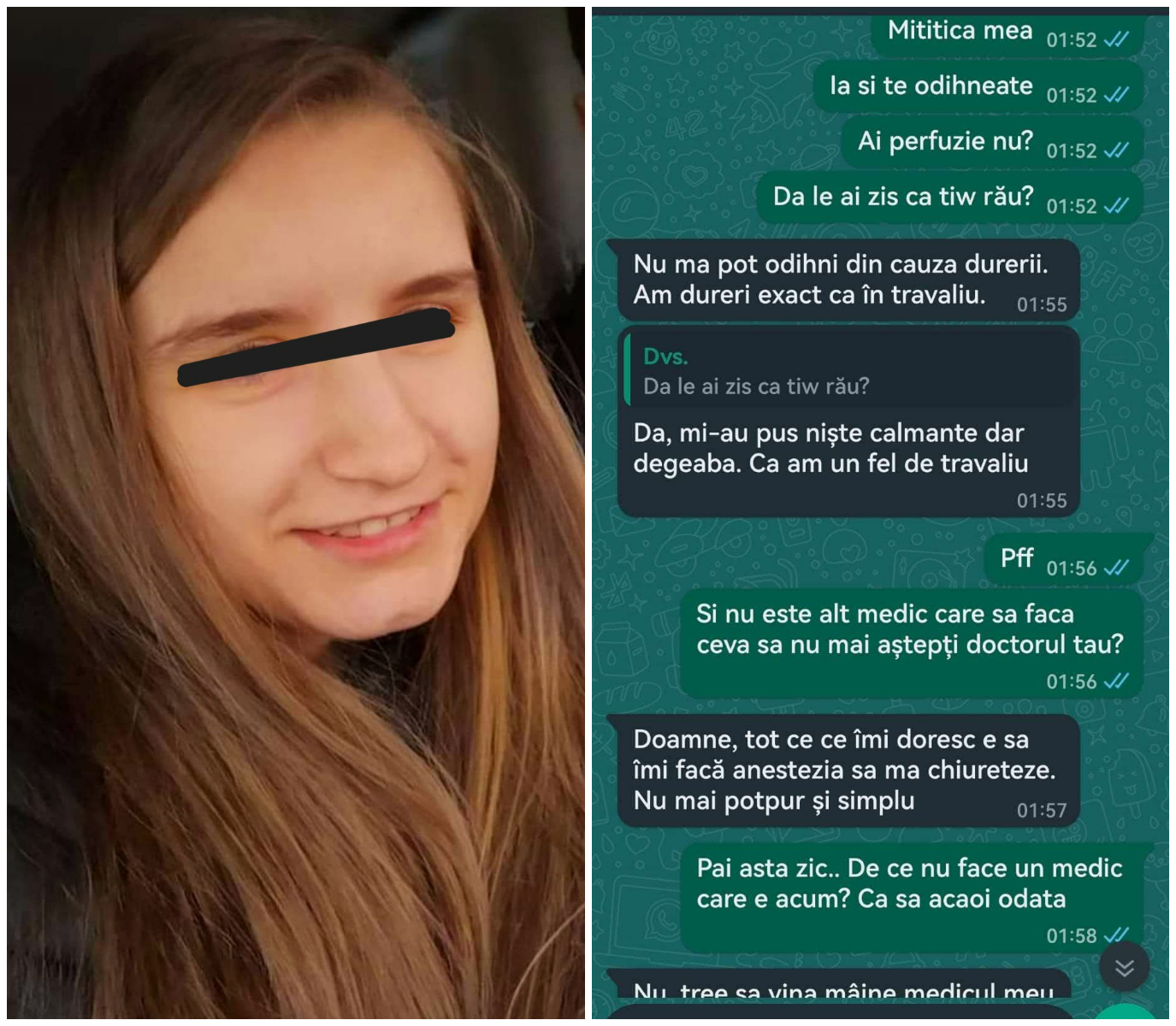 ”A sunat-o pe mama, a sunat și ea la spital, a venit asistenta care era de serviciu, asistenta a sunat pe doctoriță, i s-a făcut un calmant și i s-a zis să aștepte.