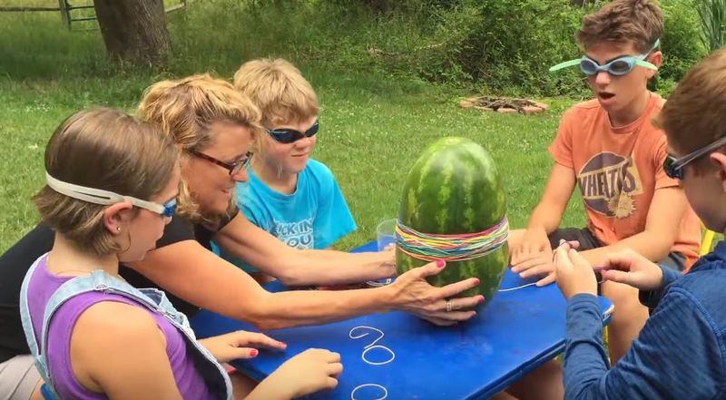 2 din 3 | Experiment inedit. Ce au facut patru copii cu un pepene urias si peste 300 de benzi elastice. Rezultatul este spectaculos