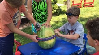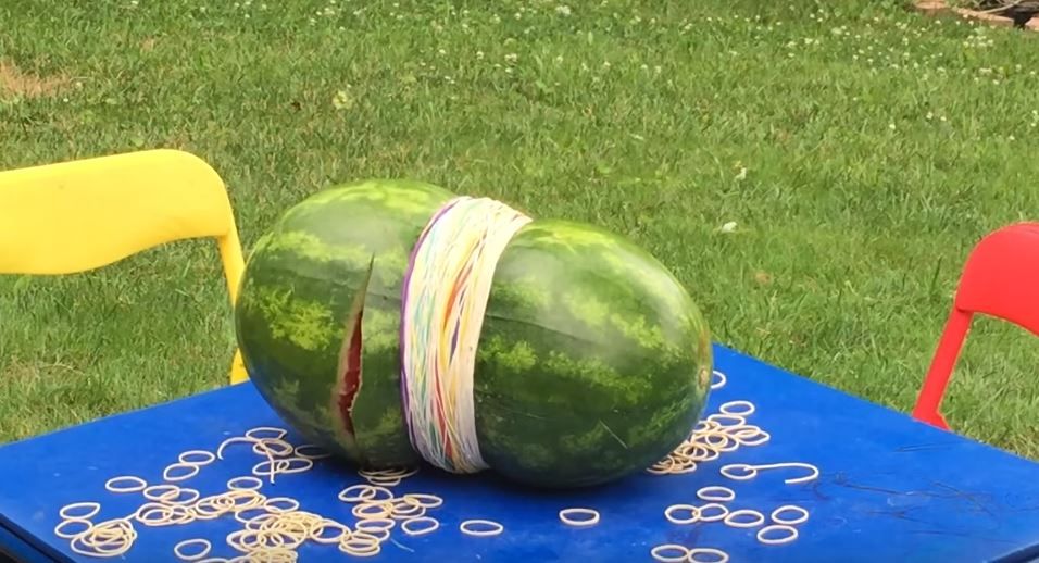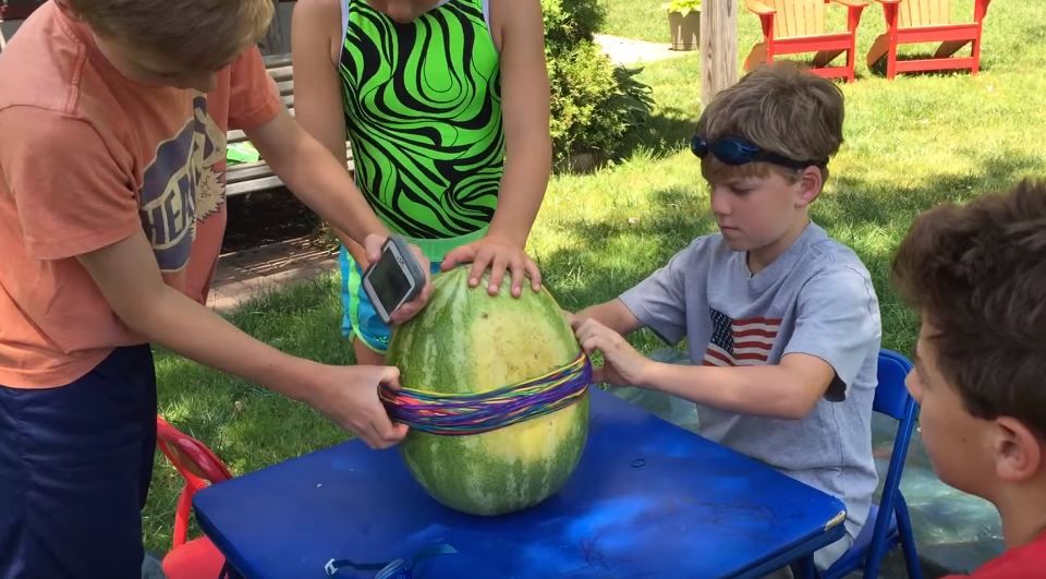 Patru copii s-au gandit sa faca un experiment inedit cu un pepene. Pustii au infasurat fructul in peste 300 de benzi elastice pentru a vedea daca explodeaza.