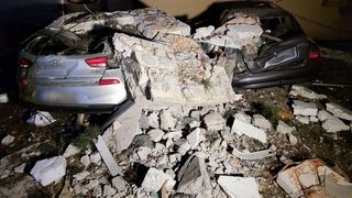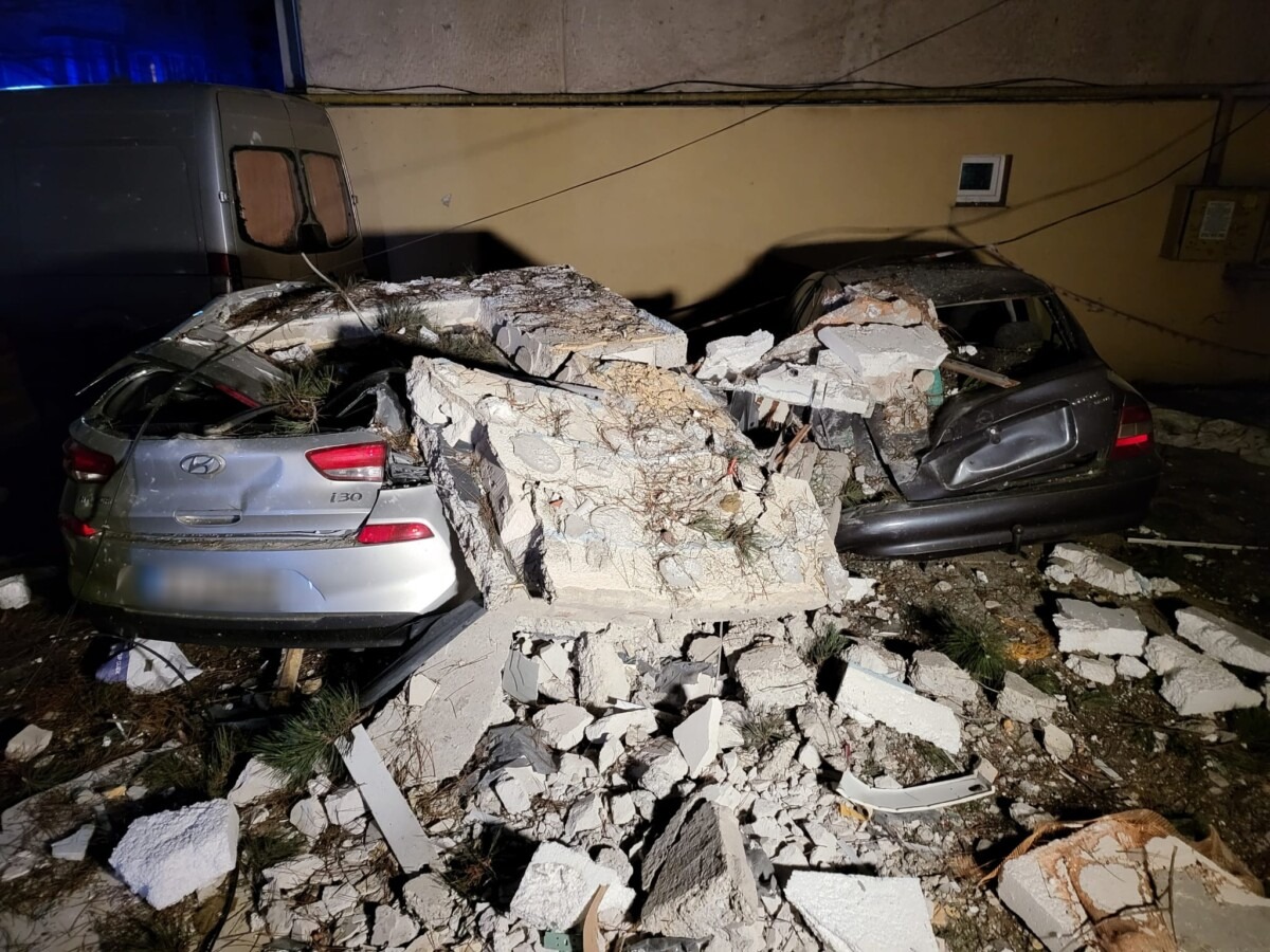 Din imaginile de la fața locului se pot vedea mai multe mașini distruse de bucățile de ciment căzute din fațada blocului.