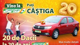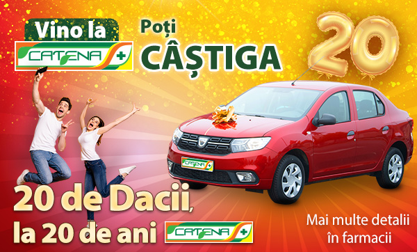 Nu uitaţi, până pe 20 decembrie 2019 aveţi şansa de a intra în marea competiţie „20 de Dacii, la 20 de ani de Catena”. Trebuie doar să cumpăraţi din orice farmacie Catena produse în valoare de minimum 30 de lei (conform bonului fiscal) şi să completaţi talonul de participare la campanie. Ulterior, depuneţi taloanele completate în urnele existente în farmaciile Catena.