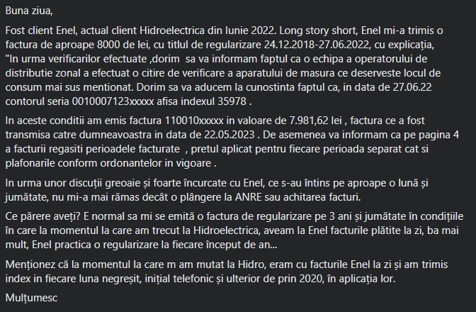 Un bărbat a relatat într-o postare pe Facebook că a primit de la Enel o factură de regularizare pe trei ani, deși din iunie 2022 şi-a trecut contractul de furnizare de energie la Hidroelectrica, iar în momentul treceri de la o companie la alta avea toate facturile plătite la zi.