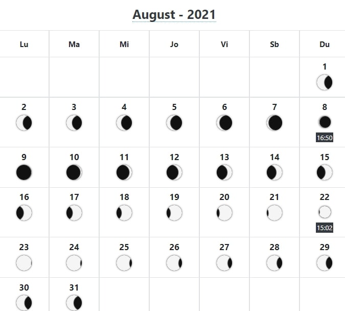 15 august, ora 18:20 – Primul Pătrar; 22 august, ora 15:02 – Lună Plină;
