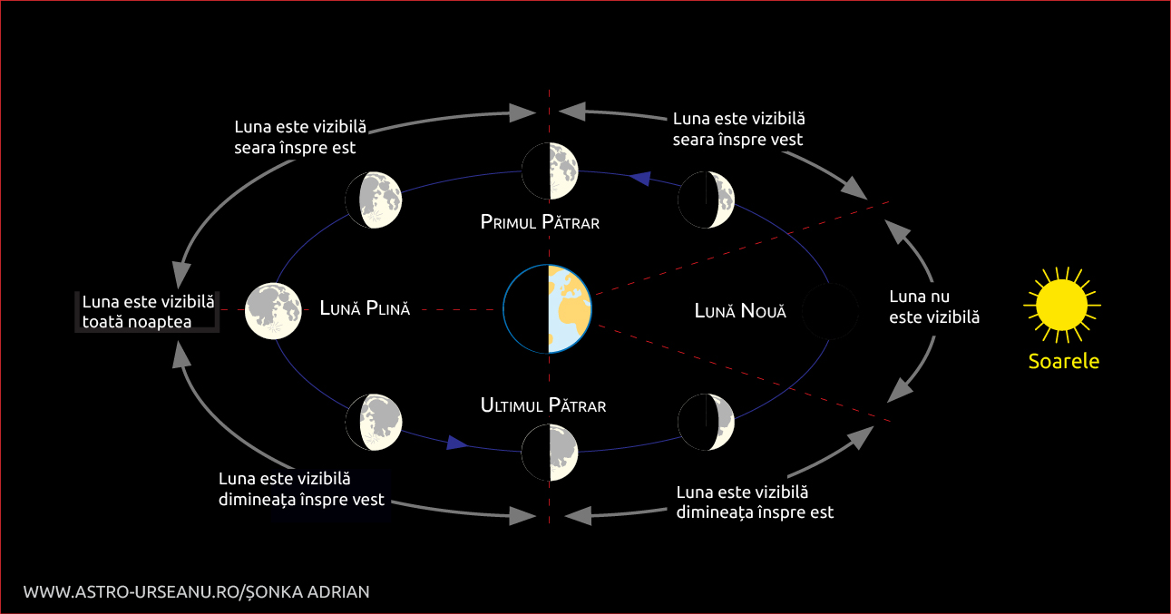 Atunci când identificăm fazele Lunii trebuie să luăm în considerare orientarea Soarelui (singura sursă de lumină), a Pământului și a Lunii.
