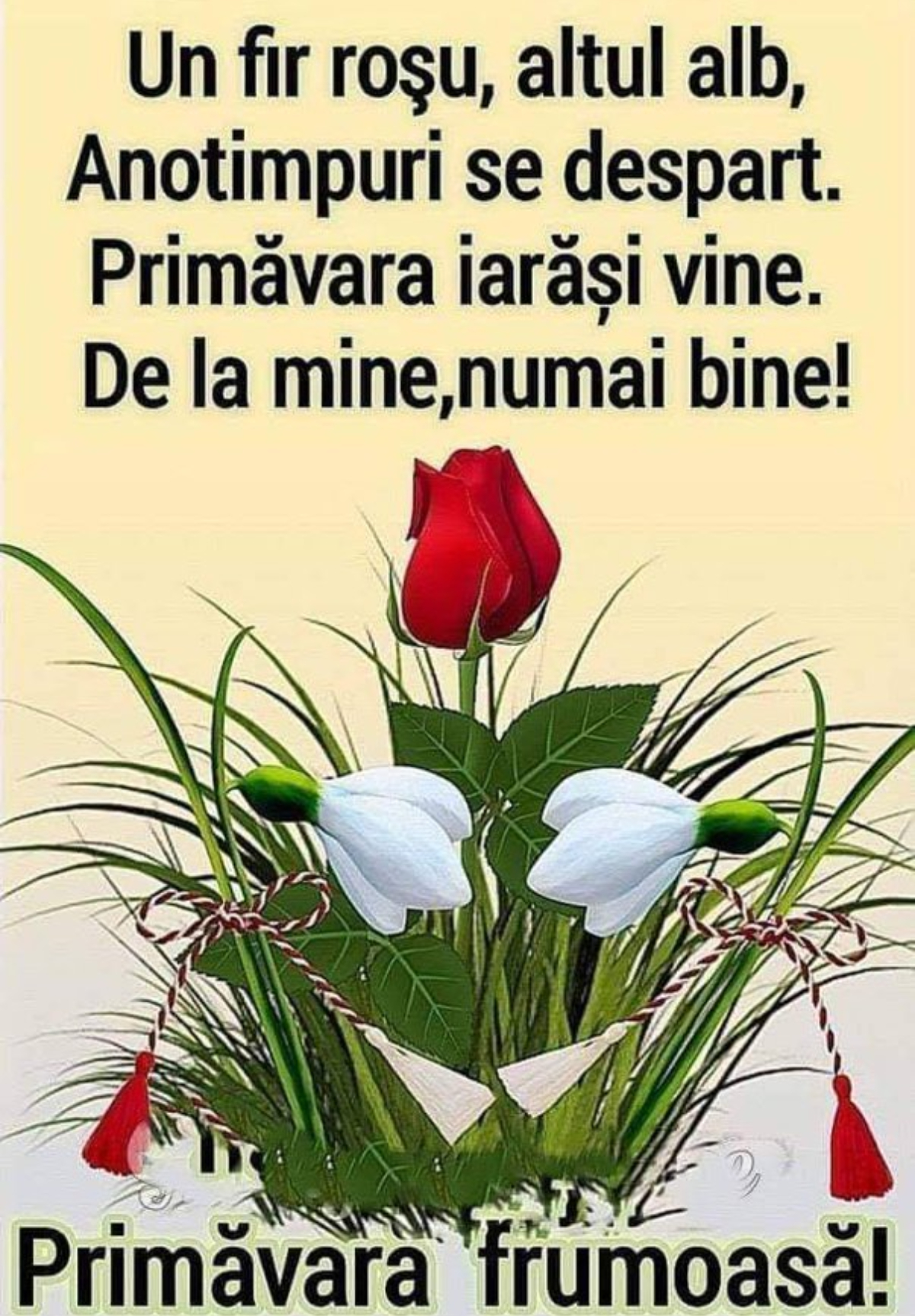 „În această zi de 1 martie, să fii înconjurat/ă de oameni frumoși și grijulii și să te simți ca o floare de primăvară! Fie ca perioada care urmează să îți aducă bucurii și împliniri multe! La mulți ani! O primăvară excepțională să ai!”