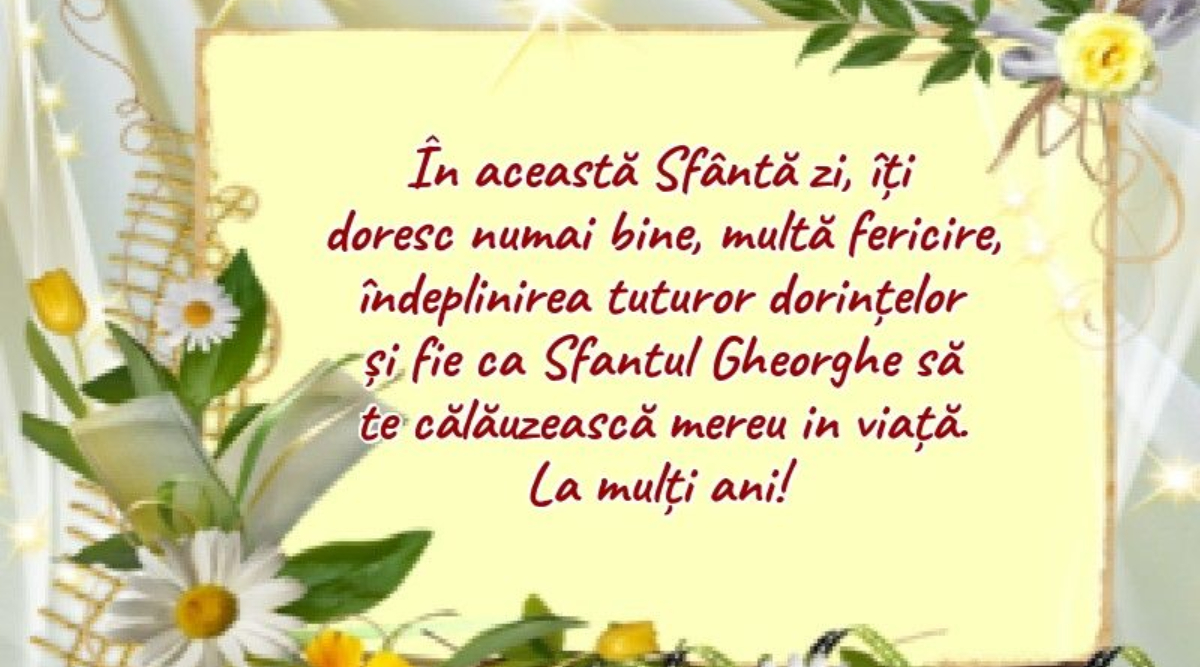 „La mulți ani cu sănătate! Să ai parte de multe realizări și să îți amintești mereu această zi minunată! Să fii voios și sănătos, iar Sfântul Gheorghe să îți ofere cele mai frumoase clipe alături de cei dragi ție!”