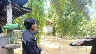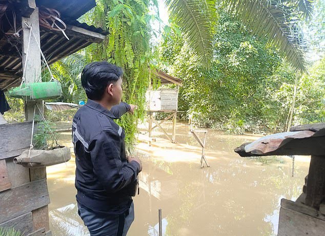 Reședința lui Munirah, o casă pe piloni, a fost inundată după ce râul Mambulu din apropiere și-a ieșit din matcă în urma ploilor abundente.