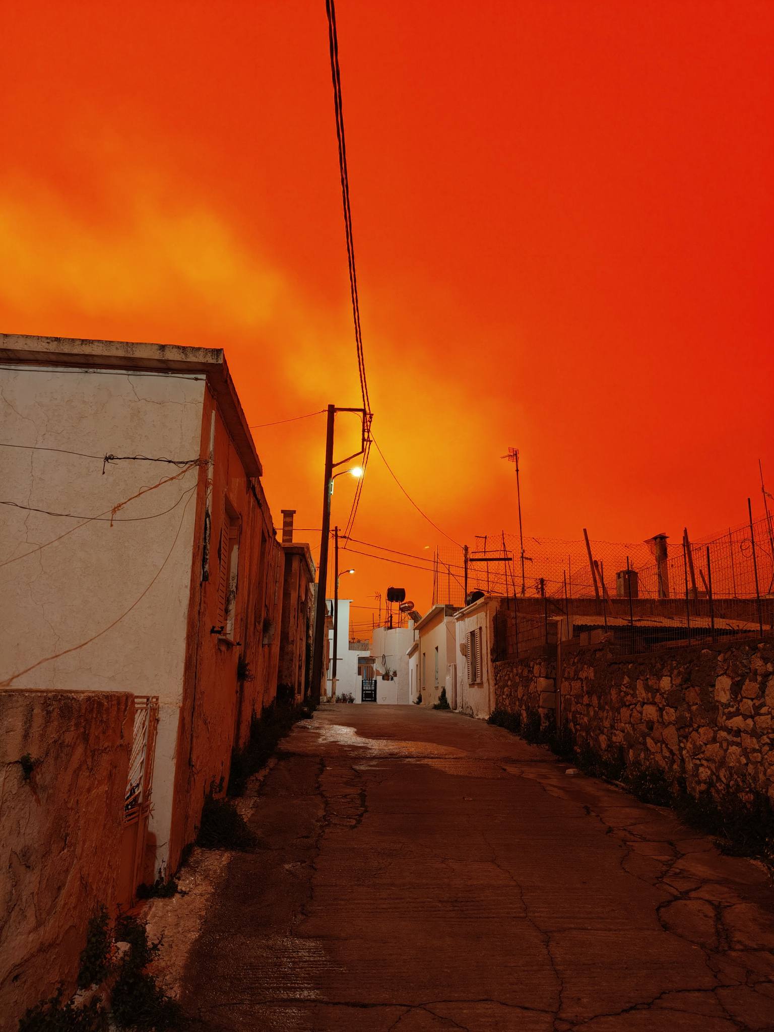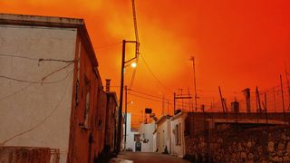 A blood-red sky is happening right now this afternoon due to a dust storm, over Crete, Greece.