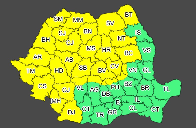 Judeţele avertizare sunt: Alba, Argeş, Arad, Bacău, Bihor, Bistriţa-Năsăud, Botoşani, Braşov, Buzău, Cluj, Caraş-Severin, Covasna, Dâmboviţa, Dolj, Gorj, Hunedoara, Harghita, Mehedinţi, Maramureş, Mureş, Neamţ, Prahova, Sibiu, Sălaj, Satu Mare, Suceava, Timiş,Vâlcea şi Vrancea.