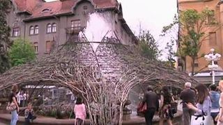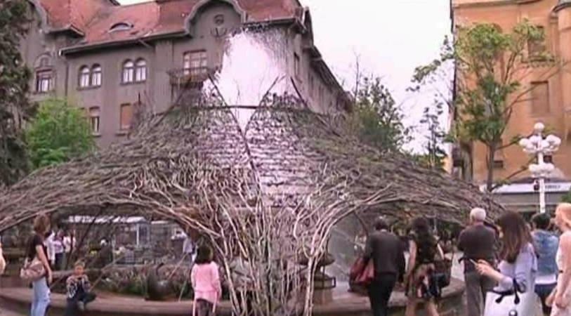 Acest aranjament din crengi si flori uscate s-a transformat intr-o cupola uriasa care acopera fantana arteziana din centrul Timisoarei.