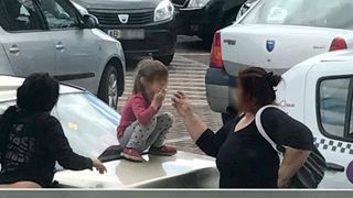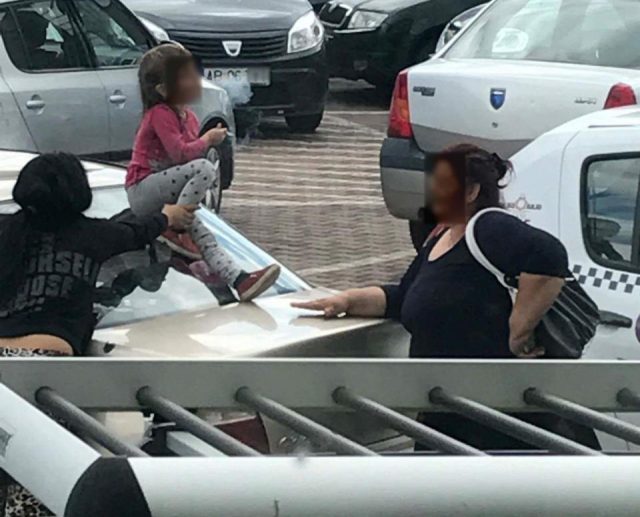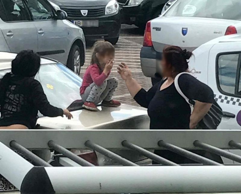 In imagini se observa cum micuta, urcata pe portbagajul unei masini, este pusa sa fumeze de catre cele doua femei care o insoteau.