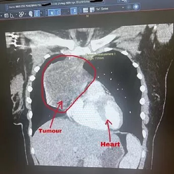 Zoe Plastiras era însărcinată în 32 de săptămâni, când medicii au descoperit o tumoare de 12 cm, de mărimea unui grapefruit, care creștea lângă inima ei.
