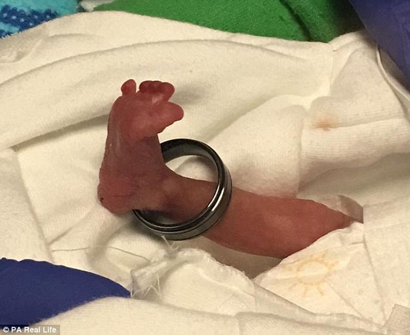 Un bebelus care a fost nascut prematur, la doar 25 de saptamani, este asa micut incat verigheta tatalui sau ii incape pe piciorus.