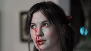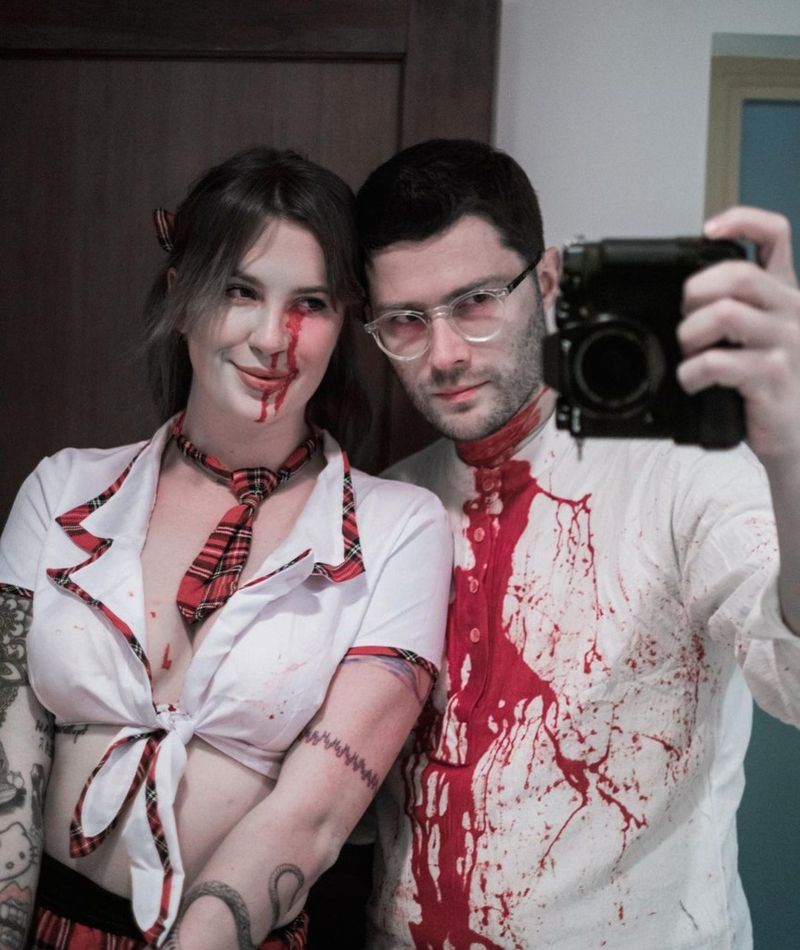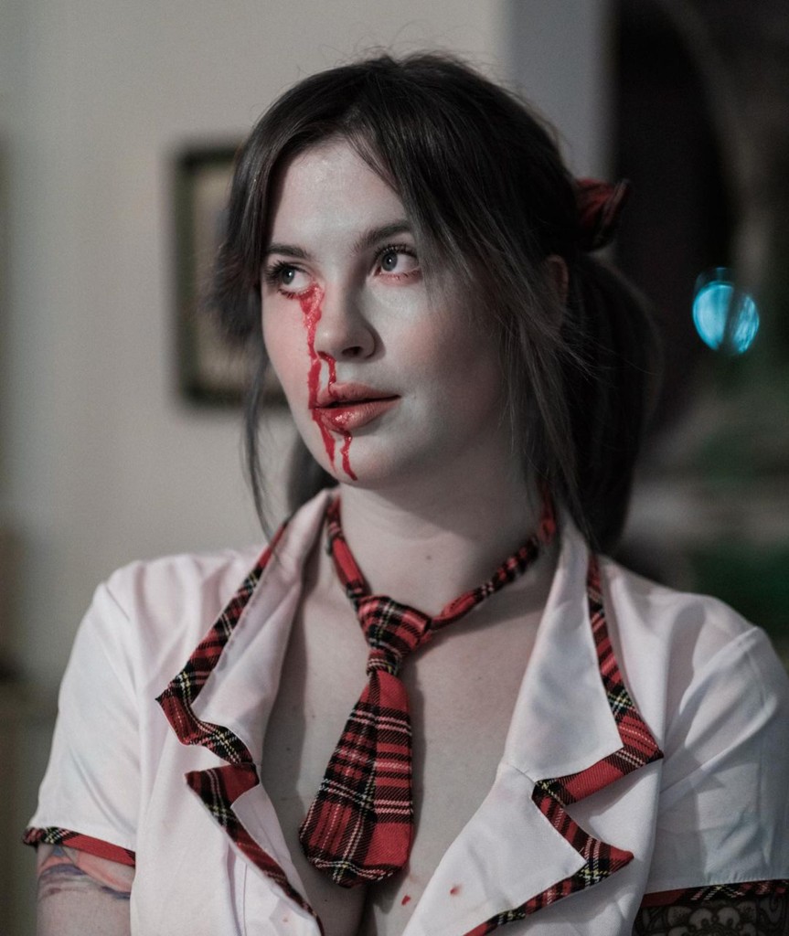 Modelul era îmbrăcat ca o elevă sexy – cu sânge fals curgând din ochiul stâng și picurându-i pe piept și bluză – în timp ce iubitul ei, muzicianul cunoscut sub numele de RAC, era îmbrăcat într-o cămașă puternic însângerată, scrie NYPost.