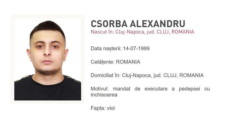 Potrivit Poliției Române, pe 8 octombrie, în urma activităților operative desfășurate de polițiștii Direcției de Investigații Criminale – Serviciul Urmăriri și ai Serviciului de Investigații Criminale din Cluj, tânărul a fost depistat și arestat în regiunea Cuenca, Spania. El era căutat național și internațional după ce fusese condamnat de Judecătoria Cluj-Napoca la cinci ani de detenție pentru viol. Faptele pentru care a fost condamnat s-au petrecut în noaptea de 29 spre 30 iunie 2020, când, împreună cu alte două persoane și cu victima minoră, s-ar fi deplasat cu un autoturism pe un câmp din Cluj-Napoca.