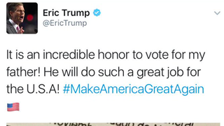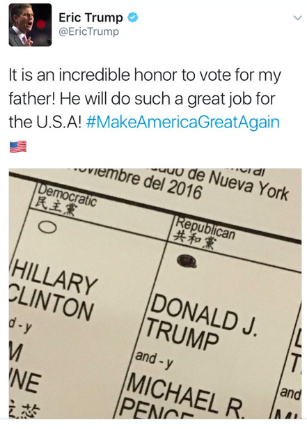 " Este o onoare incredibilă să votez cu tatăl meu! Va face atât de mult pentru Statele Unite!", a transmis Eric Trump prin Twitter, postând o imagine cu buletinul de vot.