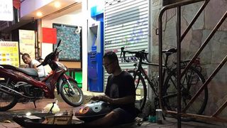 Bogdan a fotografiat si un barbat, asezat pe trotuar, care canta la un instrument de percutie. Fiul lui Pandele a lasat in urma frigul din Romania, acolo unde a petrecut Craciunul, impreuna cu cativa prieteni din Voluntari.