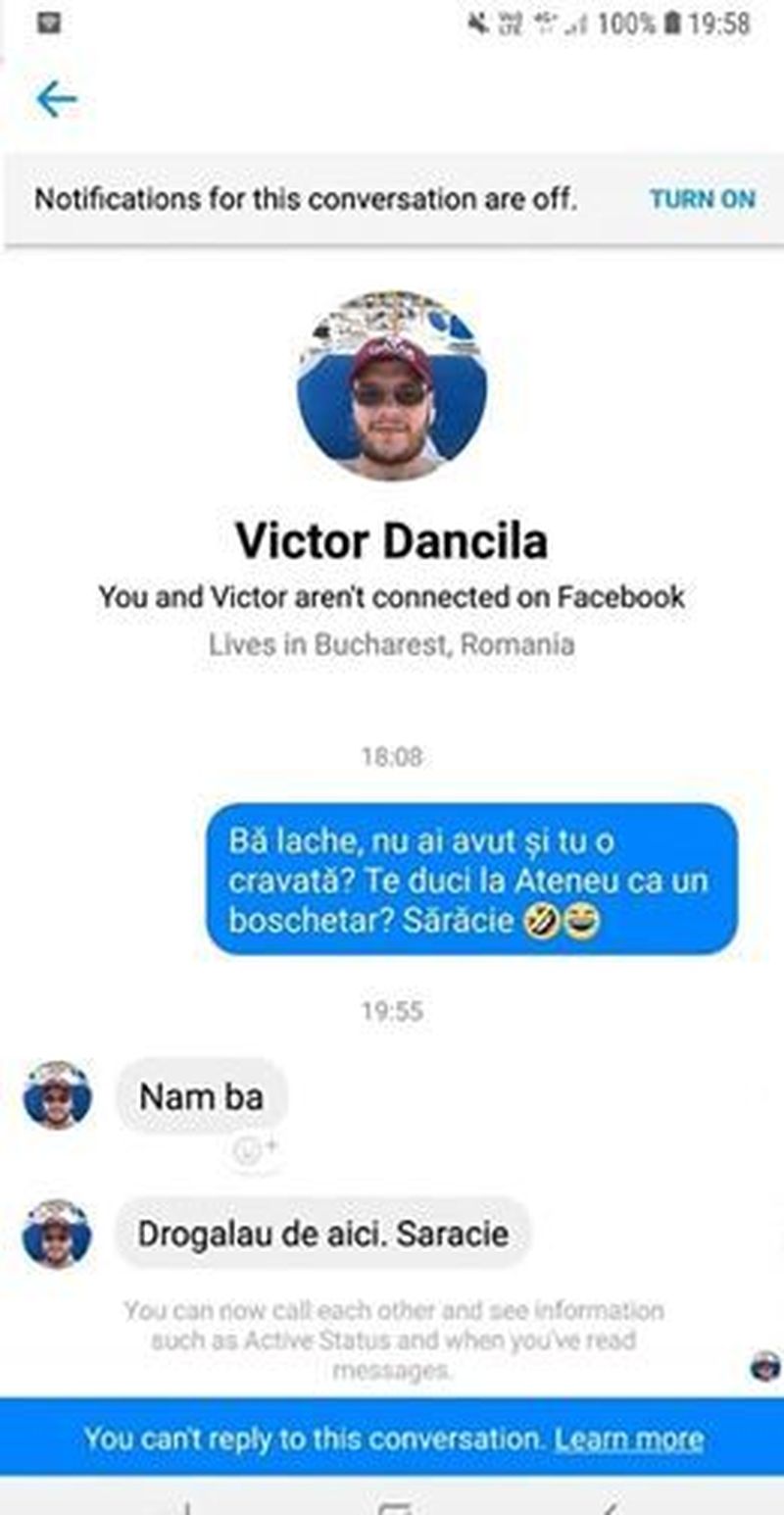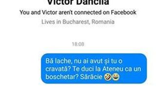E clar că fiul Vioricăi Dăncilă nu ştie să scrie corect româneşte. Ultima dovadă a fost adusă acum câteva zile. Fiul premierului României a stat în loja principală la Ateneul Român joi, 10 ianuarie, la ceremonia de inaugurare a preşedinţiei României la Consiliul Uniunii Europene. Victor Dăncilă a fost criticat pentru ţinuta sa de la Ateneu, pentru că nu a avut cravată. Un internaut i-a scris lui Victor Dăncilă.   „Bă lache, nu ai avut şi tu o cravată? Te duci la Ateneu ca un boschetar? Sărăcie”, a fost mesajul dur al celui care i-a scris fiului premierului.